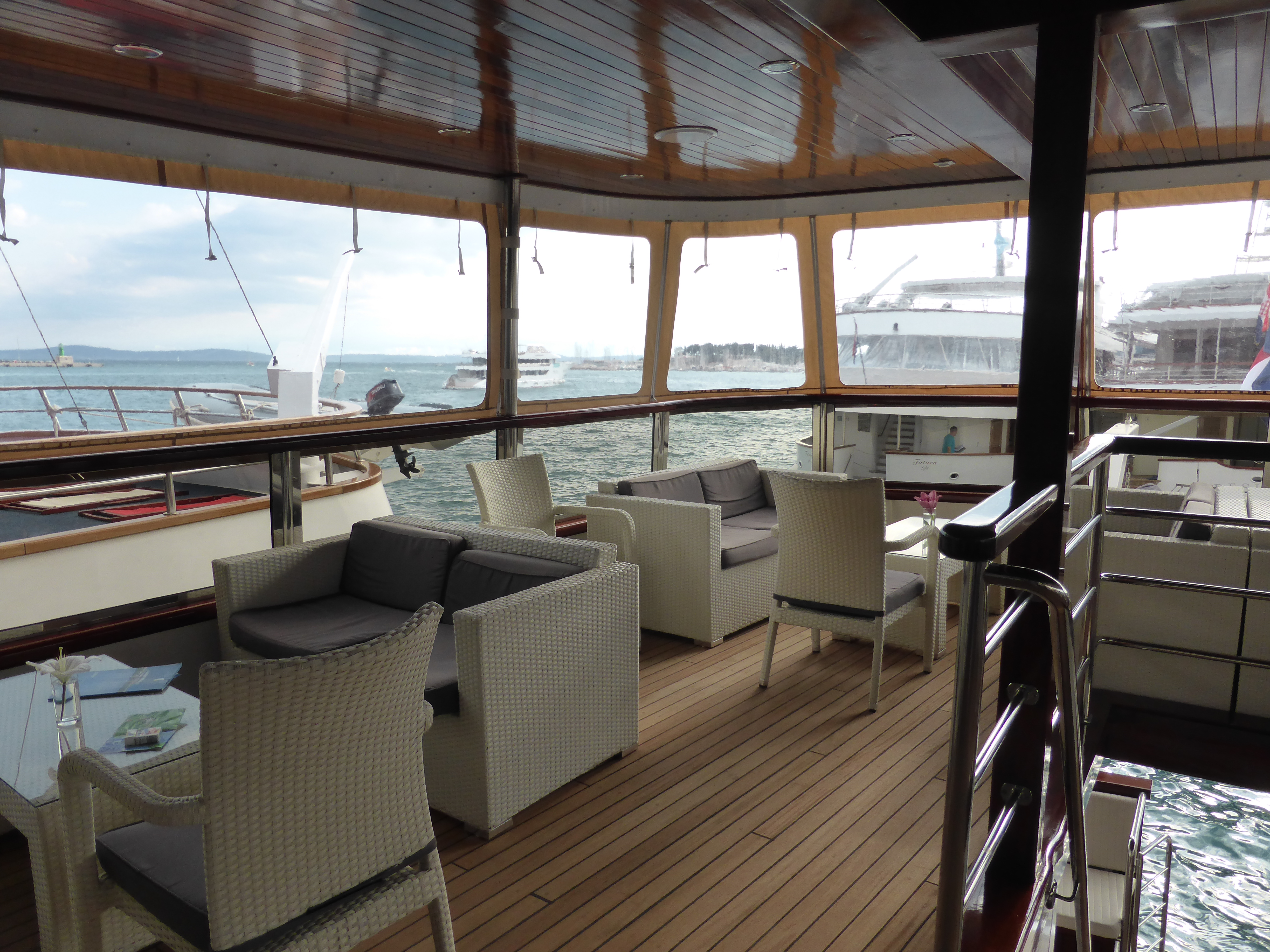 My cabin was below decks with two portholes for light. There were more cabins on the deck above, as well as a swimming platform at the rear of the boat. On the next deck was the restaurant and bar seating area. And the very top deck was simply a sun deck with loungers. Not a huge boat but big enough for me.
